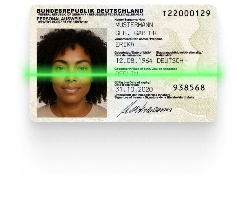 Ihre Kund:innen scannen Ausweis und Gesicht für eine sichere Identifikation mit Echtheitsprüfung.